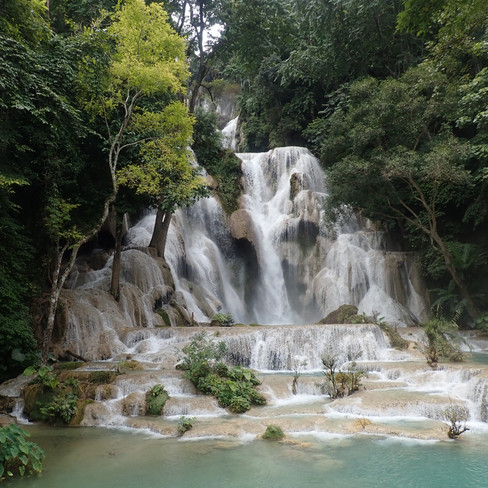 Le jour d’après on loue un scooter, et c’est parti pour les Kuang Si Falls des cascades à 45 minutes de Luang Prabang, considérées parmi les plus belles d'Asie : c'est splendide, l'eau a une couleur magnifique. On fait une petite randonnée pour monter, et on recroise... les mêmes italiens et un couple américano-allemand qui était au restaurant la veille avec nous. On redescend pour se baigner dans l'eau limpide (mais fraîche) et Armand filme, quand soudain le drone fait des siennes et chute lentement vers l’eau... jusqu’à s’écraser dans un bambou dont une branche le retiendra à un mètre au-dessus de l'eau ! Ouf ! Décidément l'électronique est contre nous !