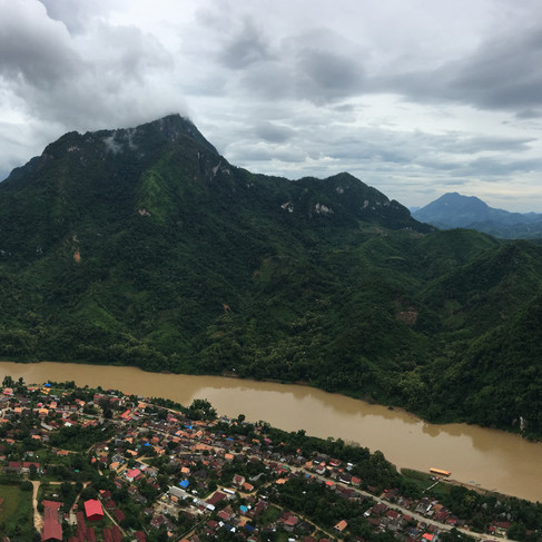 Direction la première ville dans le nord, Nong Khiaw ! On prend un mini-van avec d'autres touristes, pour la plupart espagnols. En arrivant, nous choisissons une auberge avec vue sur le Mékong et allons déjeuner dans un petit boui-boui tenu par une jeune fille. Après avoir commandé, celle-ci enfourche son scooter et part acheter les ingrédients nécessaires à nos plats ! On ne pourra pas se plaindre de la fraîcheur des aliments... Nous avions entendu parler d'un point de vue sympa pour le coucher de soleil, on passe devant le début de la randonnée et il est déjà 16h alors, pas vraiment équipés, on se motive à y aller... sauf que ça s'avère être plus de l'escalade que de la randonnée, le tout hyper glissant car couvert d'une petite bruine. Nous croisons deux français qui sont en train de redescendre et on se dit tous les 4 qu'il n'y a vraiment que des français pour se motiver à faire cette montée. La vue vaut le coup cependant :